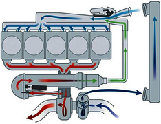 Система регенерации кинетической энергии в системе выпуска отработавших газов- имеет разные конструктивные исполнения. Принцип работы: за счет кинетической энергии отработавших газов, обеспечить работу турбокомпрессора, который осуществляет подачу воздушной массы в камеры сгорания ДВС. Посредством турбокомпрессора и испарителя, обеспечивается рециркуляция отработавших газов, т.е., подача «охлажденных» отработавших газов в камеры сгорания ДВС.
